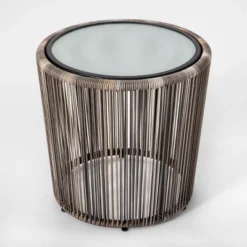- Textured white fabric shade diffuses light with a soft glow